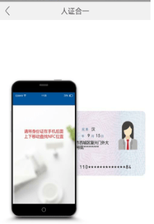 第二步:进行人证合一验证,包括读取身份证信息(读取身份前请确保NFC功能为开启状态,按手机屏幕提示,将身份证贴在手机后面上下移动查找NFC位置)、人脸识别等操作。