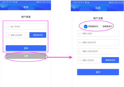 未注册用户可选择家政服务员用户进行注册。注册时需填写姓名、身份证号、手机号并通过短信验证。点提交: