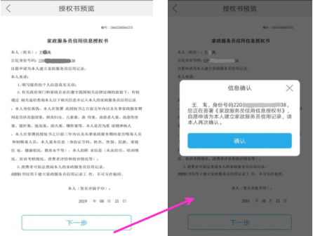 第三步:人脸识别成功后,需签署家政服务员信用信息授权书,点击下一步,并确认信息后,再次进行刷脸授权。授权成功即注册完毕。